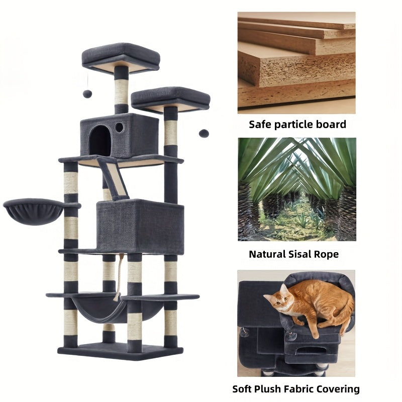 66.1/44.1in Cat Tree, Large Cat Tower with 13 Scratching Posts, 2 Perches, 2 Caves, Hanging Basket & Hammock, Pompoms, Stable Kitty Play House, Multi-Level Plush Cat Condo for Indoor Cat, Easy to Assemble, Perfect Children's